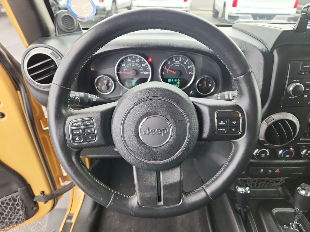 Our dealership has already run the CARFAX report and it is clean. A clean CARFAX is a great asset for resale value in the future. This 2014 Jeep Wrangler features a hands-free Bluetooth phone system. This unit has satellite radio capabilities. Maintaining a stable interior temperature in this vehicle is easy with the climate control system. With the keyless entry system on the Jeep Wrangler you can pop the trunk without dropping your bags from the store. It has a V6, 3.6L high output engine. The Jeep Wrangler features elegant lines colored with a long lasting sand colored finish. When you encounter slick or muddy roads, you can engage the four wheel drive on the vehicle and drive with confidence. Enjoy the tried and true gasoline engine in this 2014 Jeep Wrangler . This 2014 Jeep Wrangler features heated side mirrors keeping the ice off and your vision spot-on. The Electronic Stability Control will keep you on your intended path.